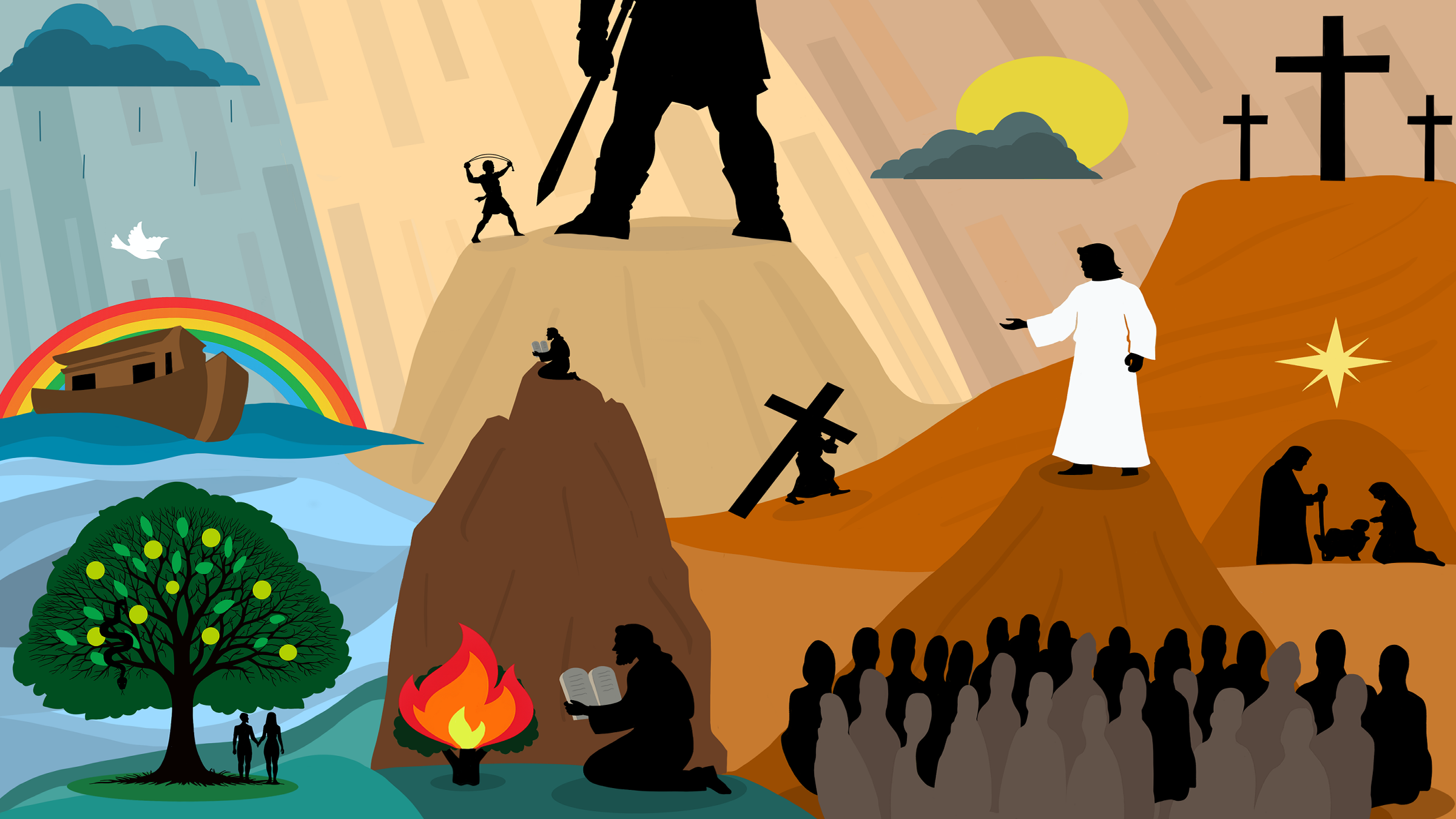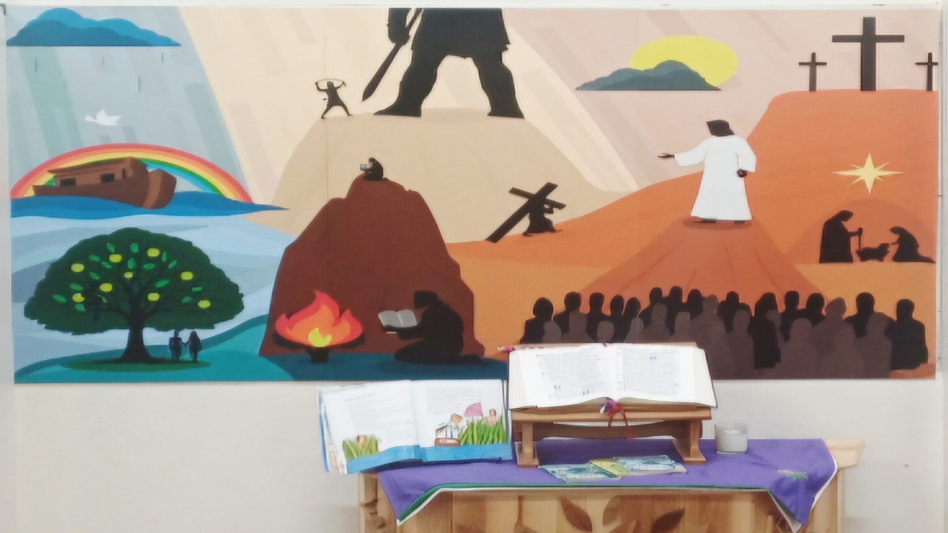 Installed Religious Education mural created for a primary school reflection space. The artwork explores key stories and themes through bold silhouette imagery to support discussion, reflection and curriculum learning.