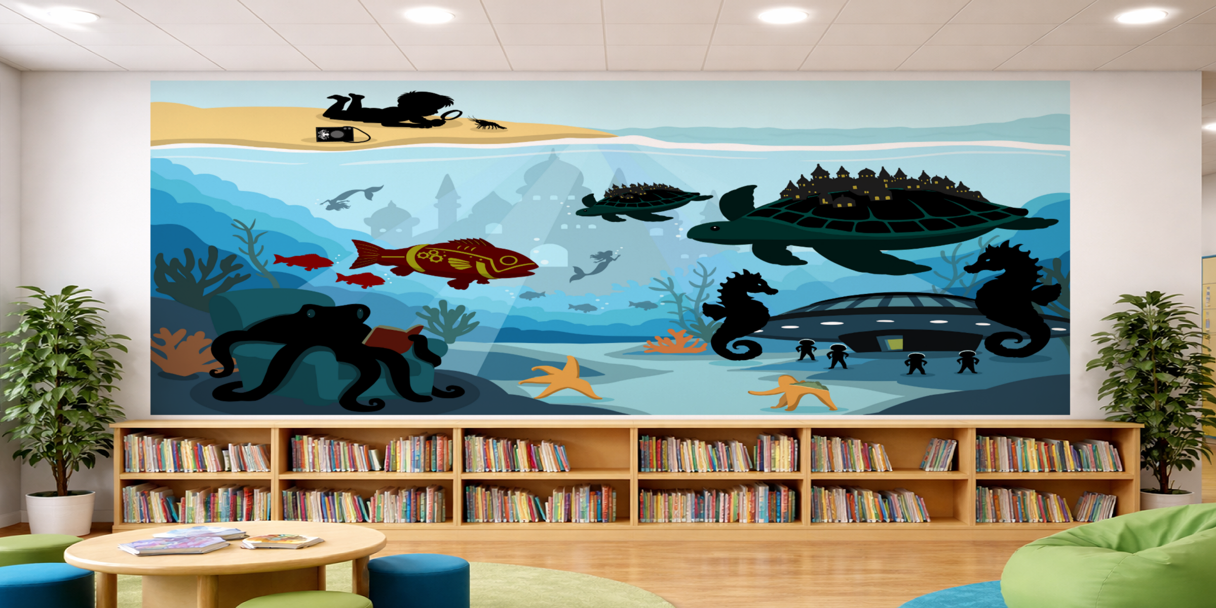 Created in a vibrant, bold silhouette style, the design transforms library walls into an immersive underwater world that encourages curiosity, creativity and a love of reading.